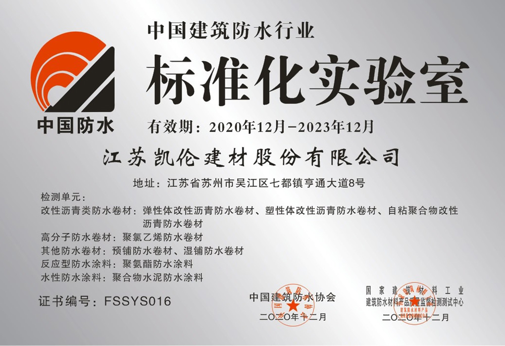 建筑防水行業標準化實驗室,由中國建筑防水協會和國家建筑材料工業建筑防水材料產品質量監督檢驗檢測中心聯合評定,通過對實驗室人員資質、檢驗設備、檢驗方法、產品對比試驗等項目的綜合考評,各項分值達標后方可通過。標準化實驗室,是對企業生產研發水平的肯定。